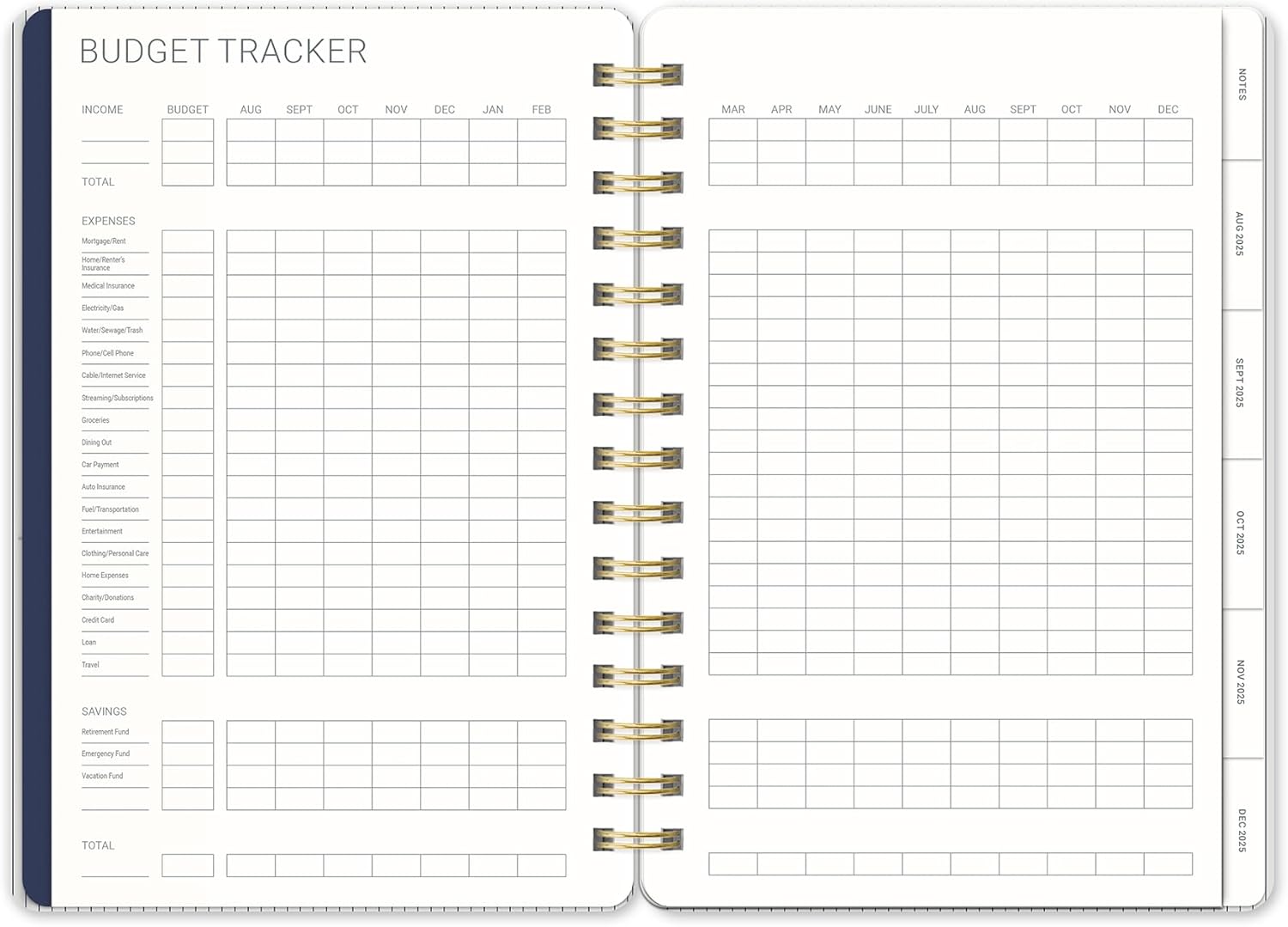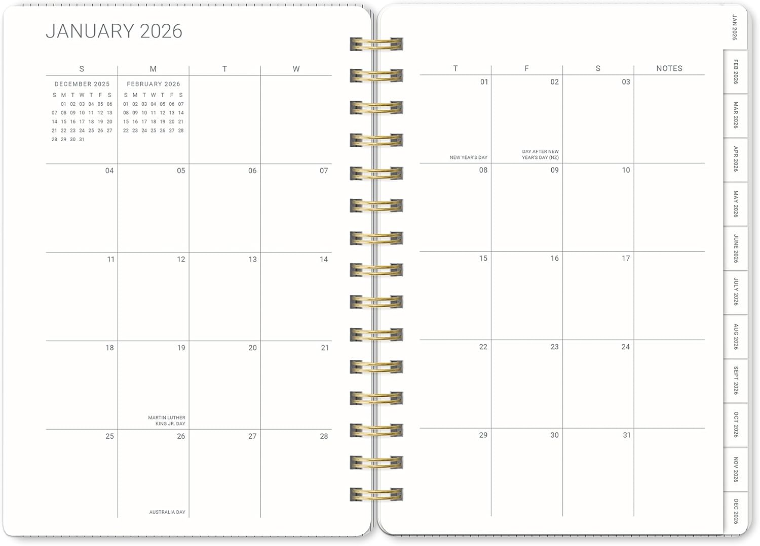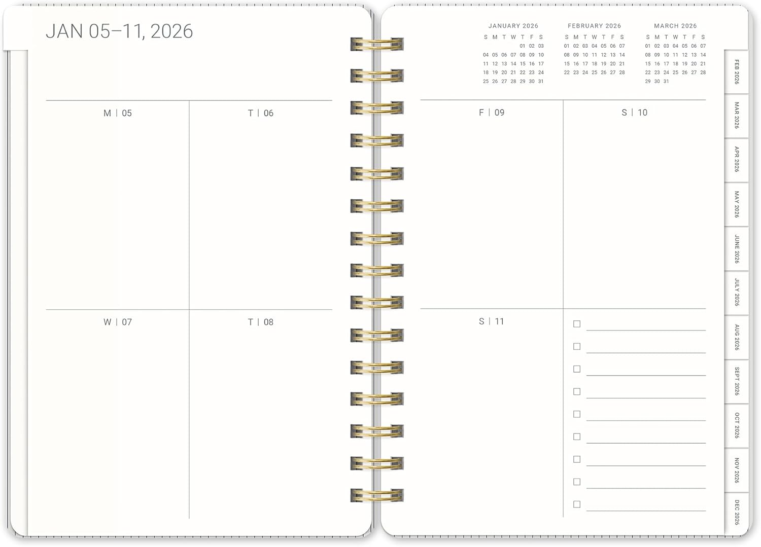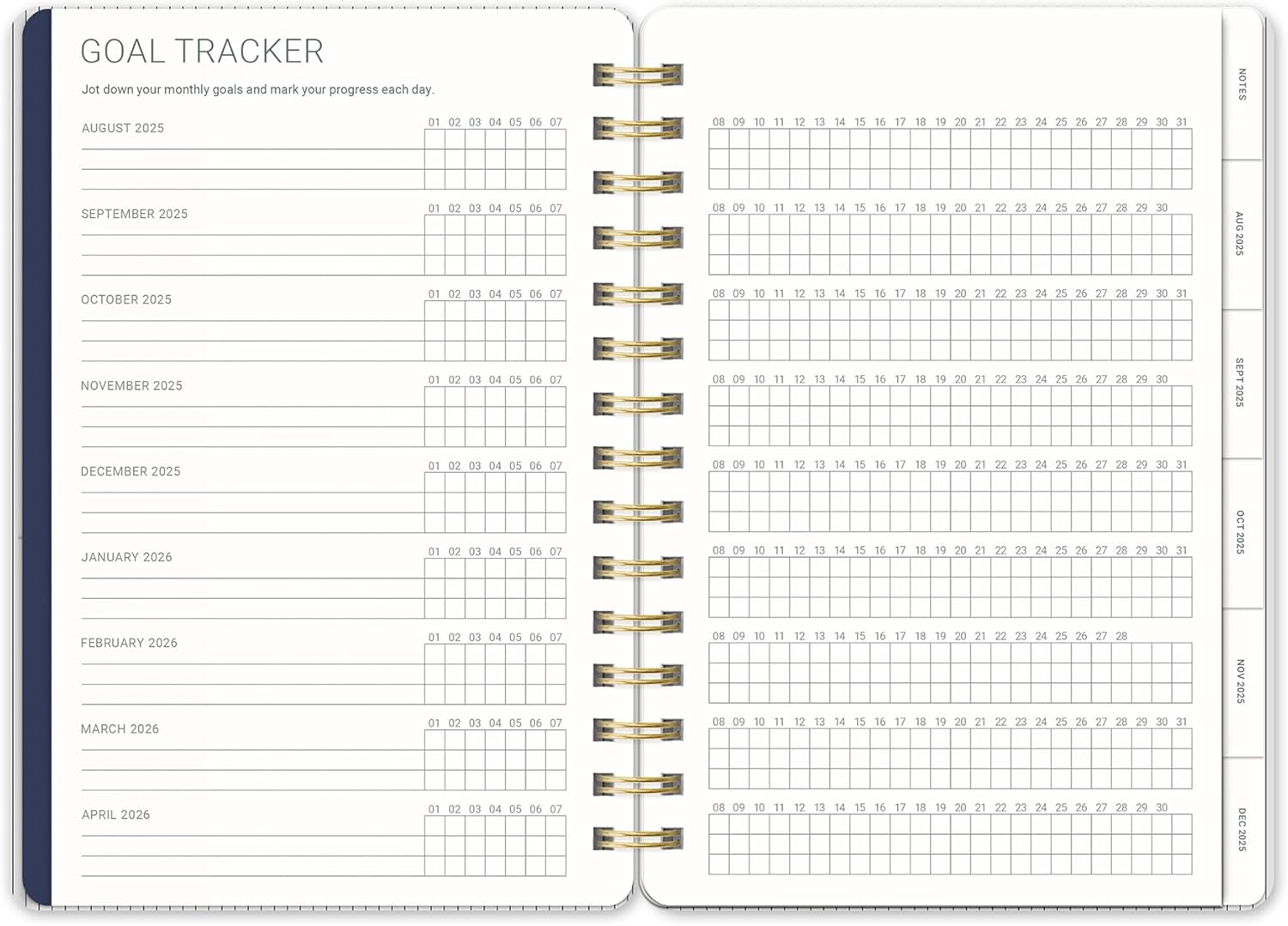 Planificación eficiente: incluye vistas mensuales y semanales por página, ideales para organizar eventos, tareas y objetivos de manera clara y accesible.
