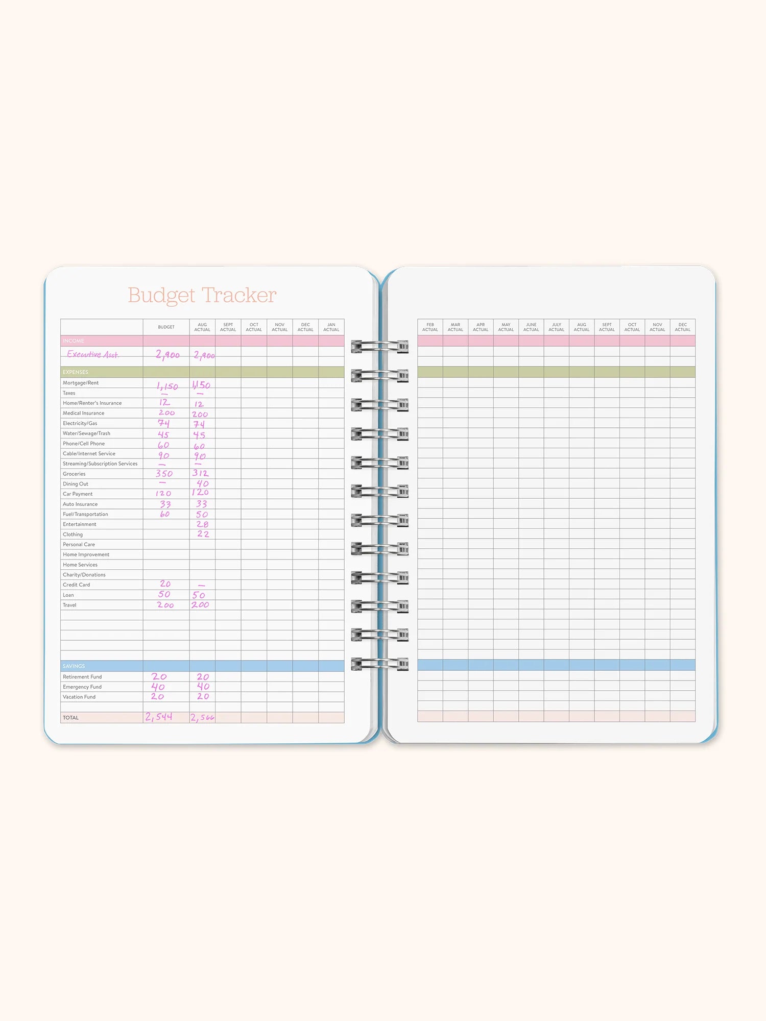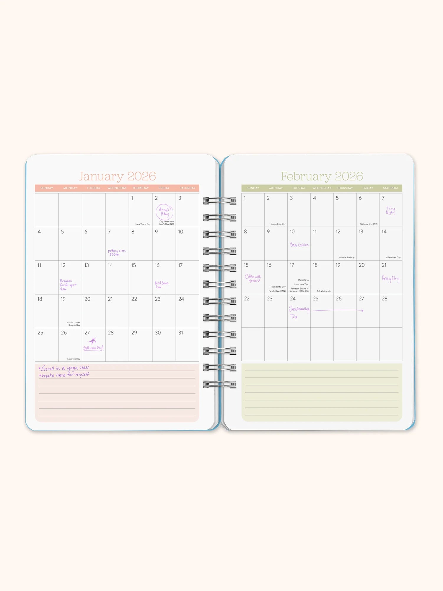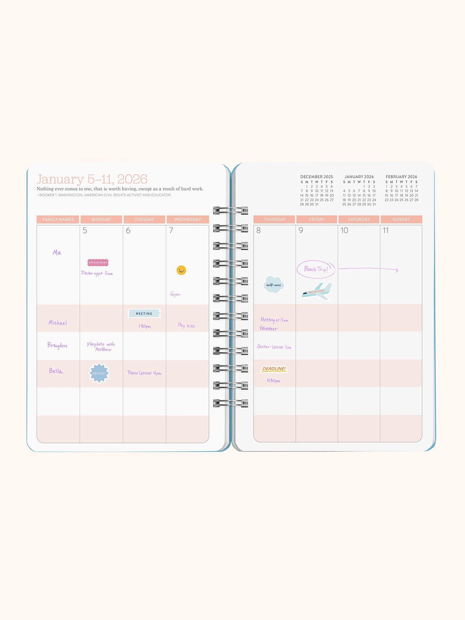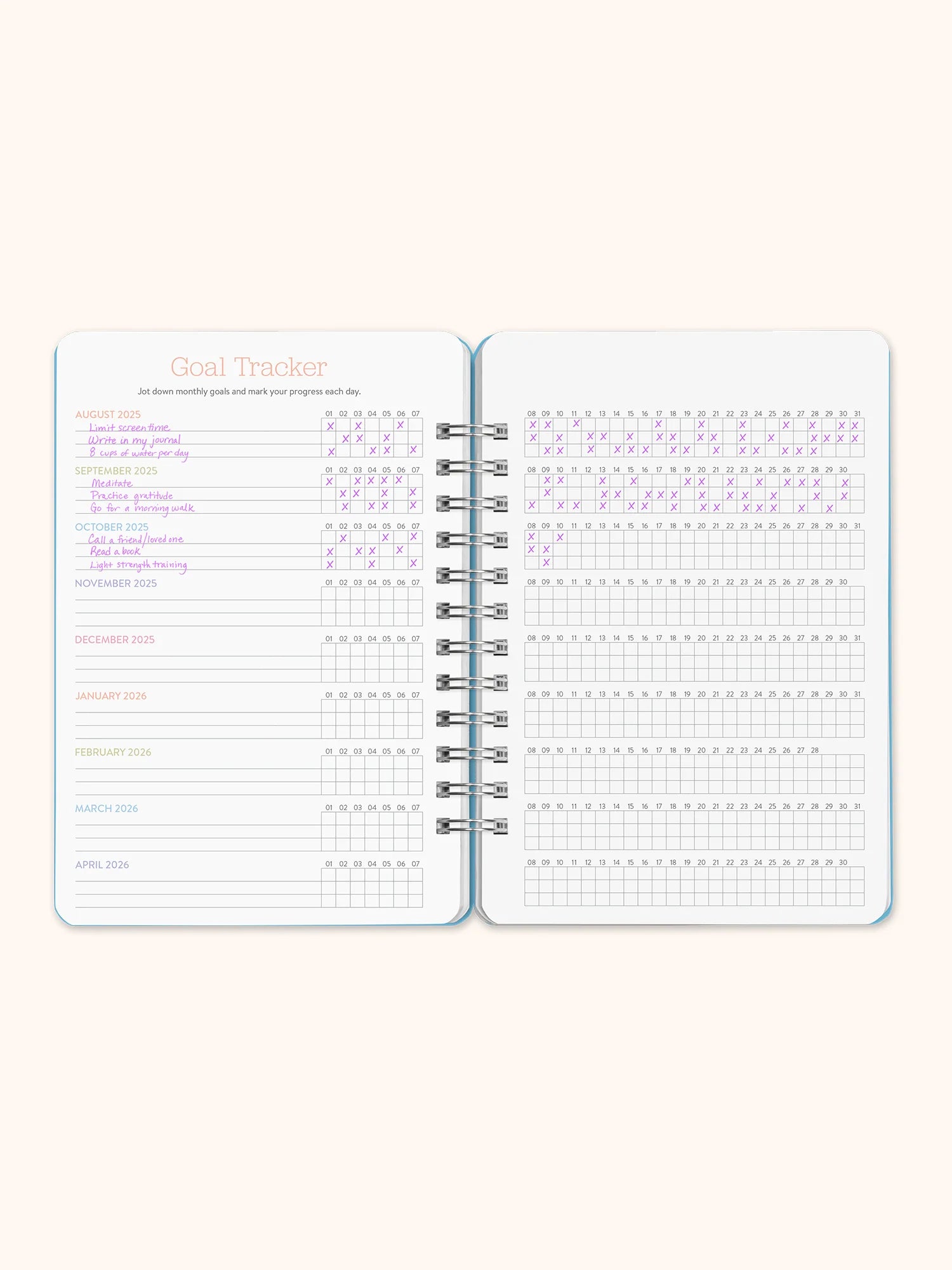 Incluye vistas anuales, mensuales y semanales, además de frases inspiradoras semanales que te motivarán día a día.