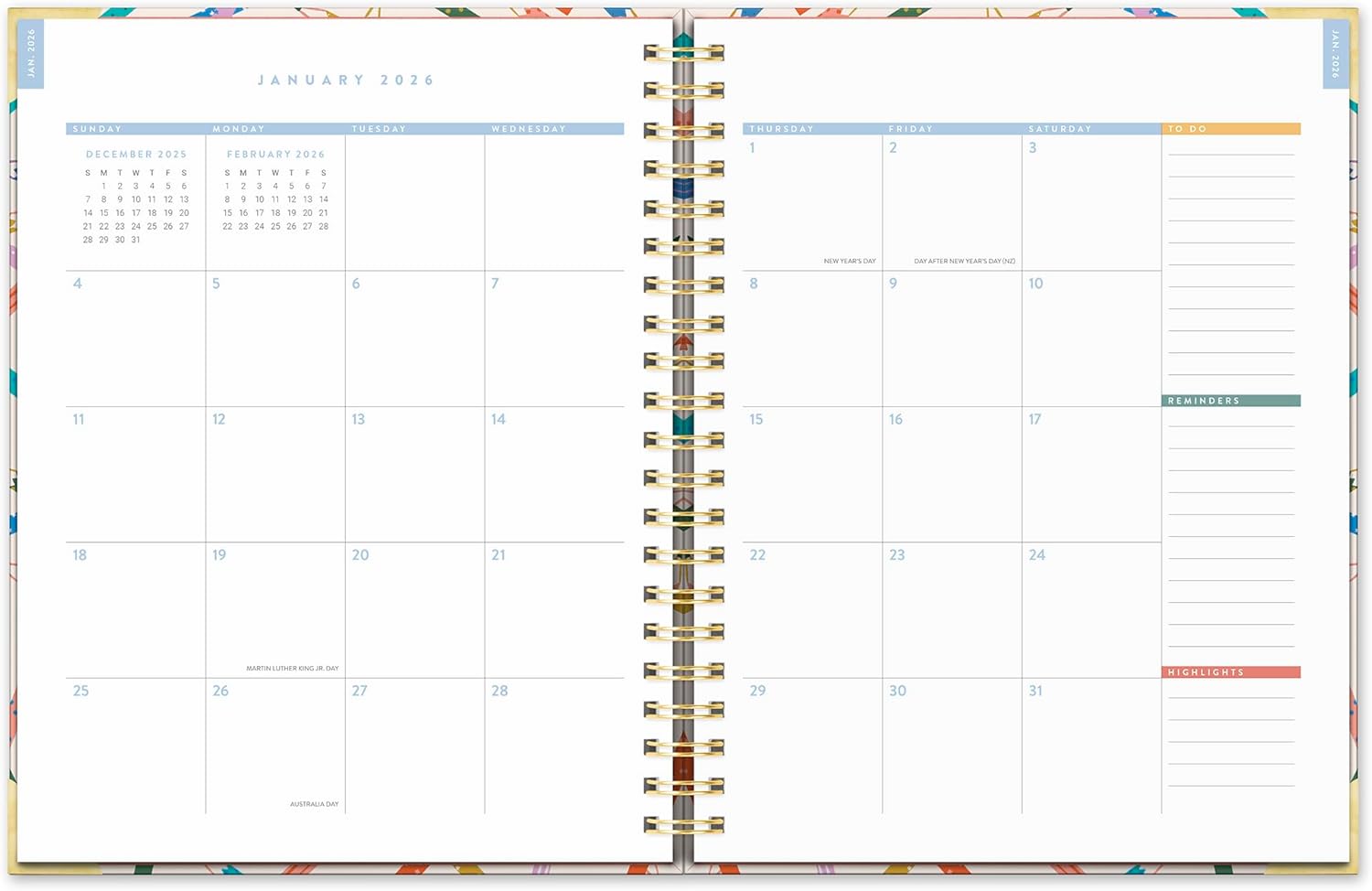 Funcional y elegante: su cubierta dura con detalles en relieve y encuadernación de espiral metálica garantizan durabilidad y estilo. Es compacta y práctica para llevar en tu bolso, ideal para mantenerte organizada dondequiera que vayas.