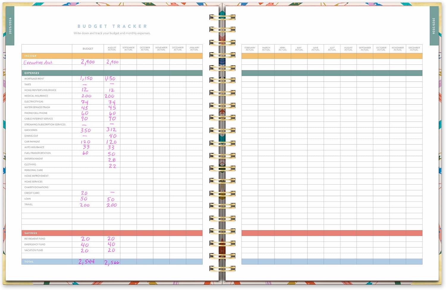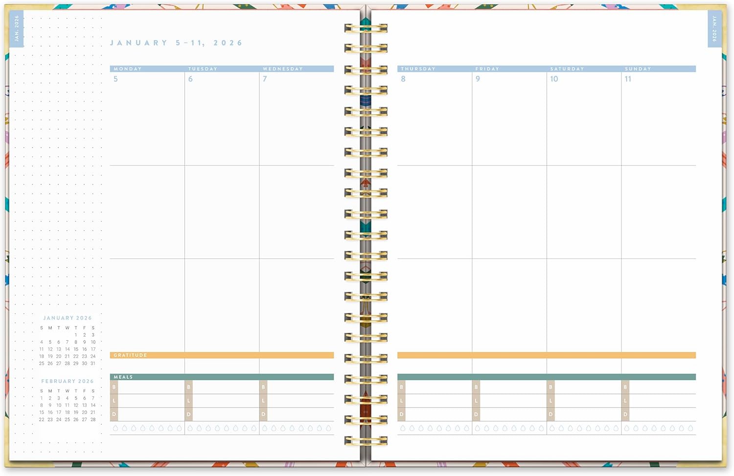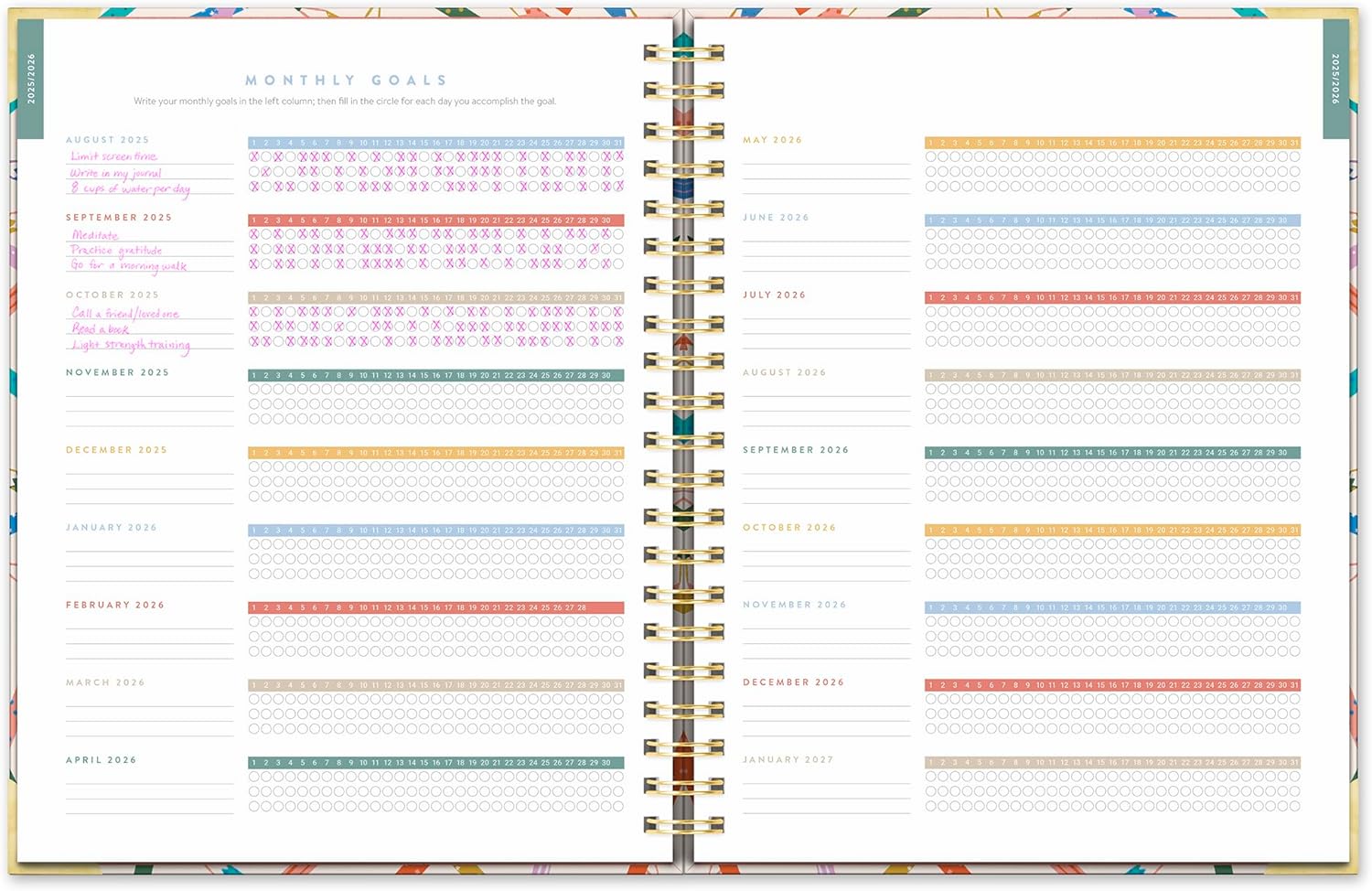 Agenda todo en uno: cuenta con una cubierta dura con protectores dorados en las esquinas, un rastreador de objetivos para mantenerte enfocada y un rastreador de hidratación para cuidar tu bienestar. Además, incluye amplios espacios para notas, citas y recordatorios.
