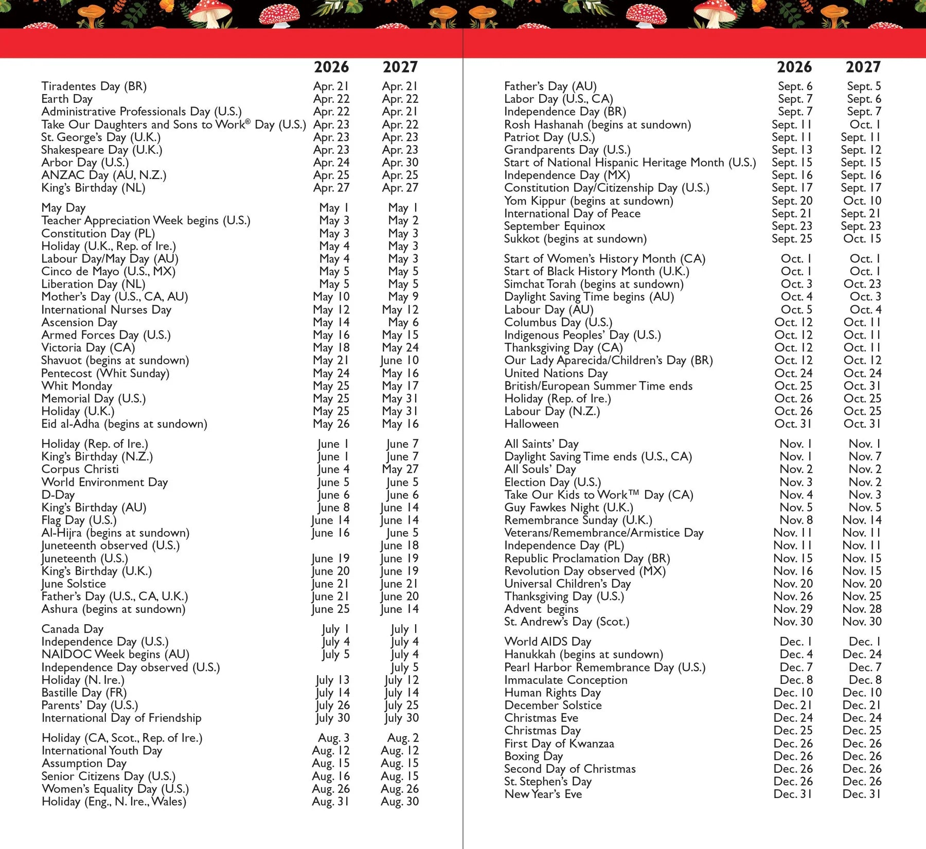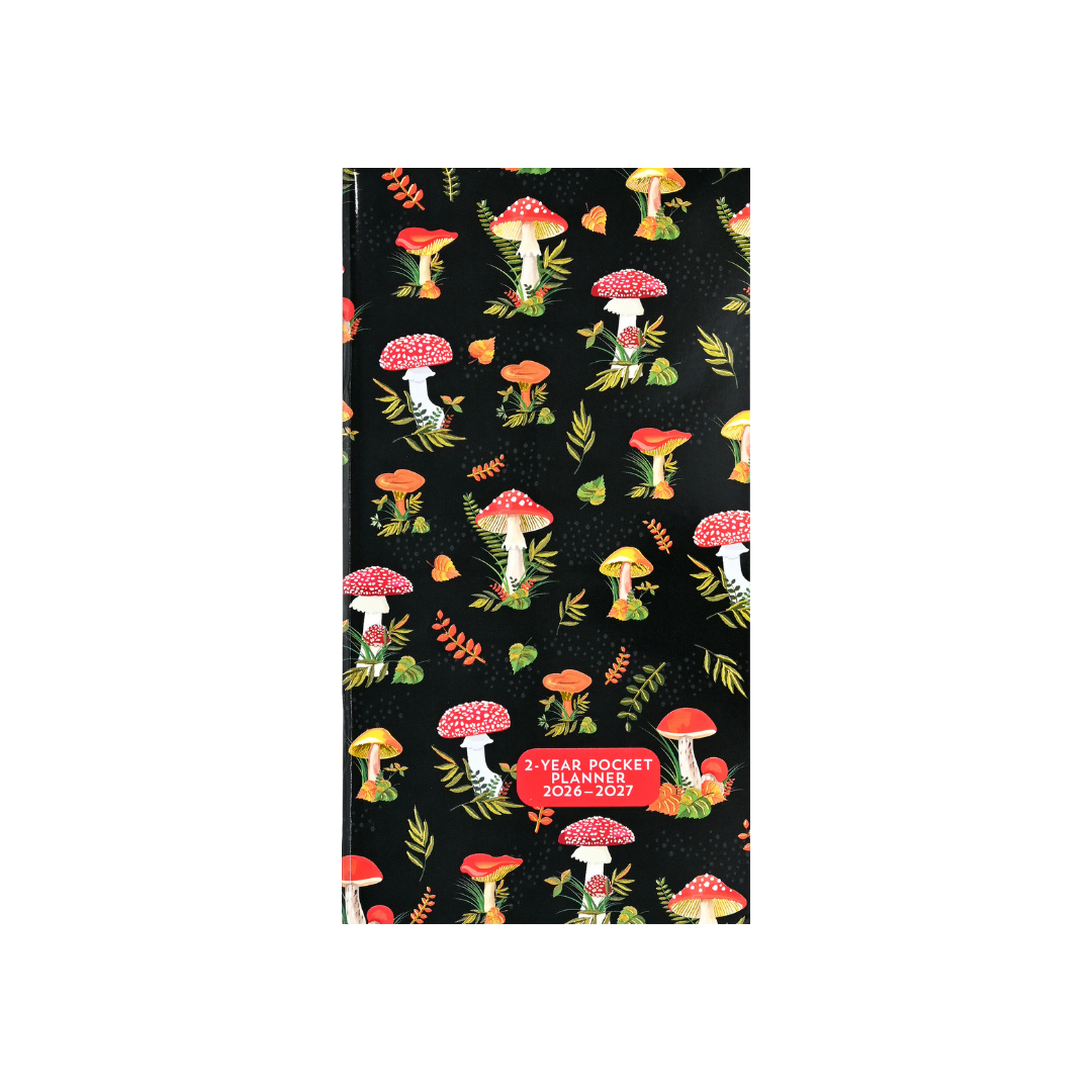 Un calendario compacto y práctico para llevar en cartera o bolsillo, ideal para organizarte mes a mes durante dos años completos. Su portada negra mate con ilustraciones de hongos y detalles en foil dorado le da un estilo único y llamativo.