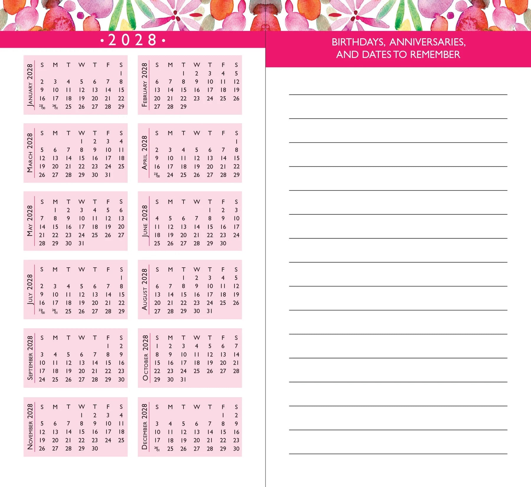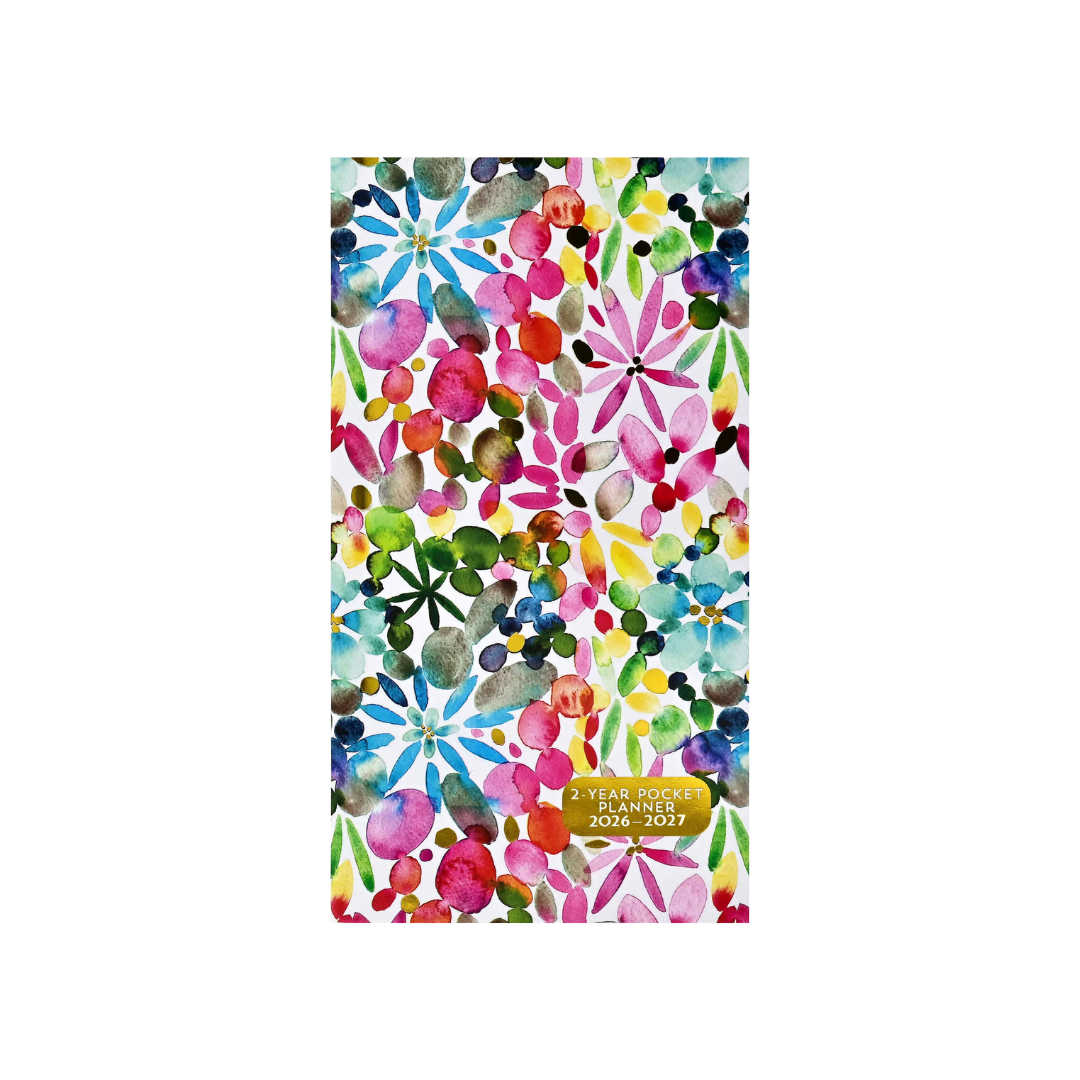 Un planificador compacto y práctico para llevar en la cartera o el bolsillo, ideal para organizarte mes a mes durante dos años completos. Su portada está decorada con delicadas flores en acuarela en tonos rosados, azules, verdes y amarillos, realzada con detalles en foil dorado que le dan un toque elegante y alegre.