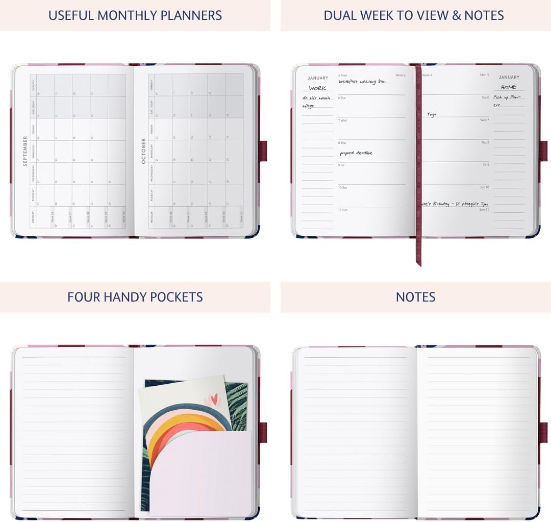 El diseño week-per-page te ofrece una planificación clara y rápida, con calendario anual completo, sección de notas y espacio para horarios.