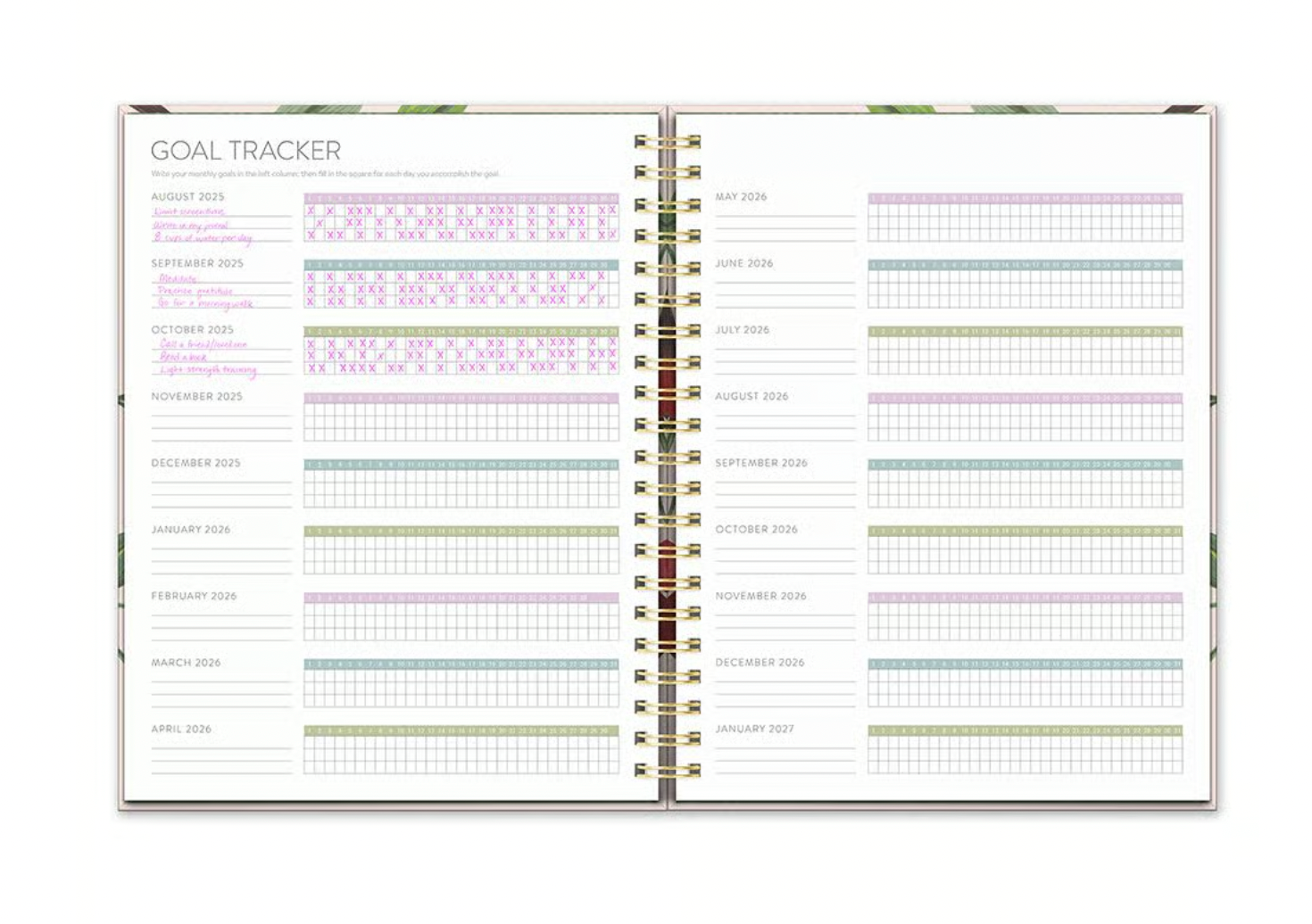 En su interior encontrarás amplias cuadrículas para anotar citas, recordatorios y notas personales, además de secciones dedicadas al seguimiento de objetivos y bienestar.
