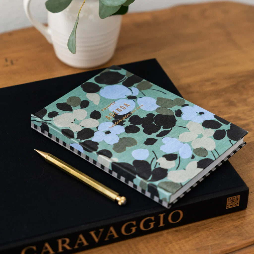 Una agenda y diario en un solo producto, con diseño de la colección Memento. Encuadernada en tapa dura con tela de libro, incluye detalles en foil dorado metálico y encuadernación que permite apertura plana. Su sistema de doble portada permite alternar entre planificador semanal sin fechas y cuaderno rayado.
