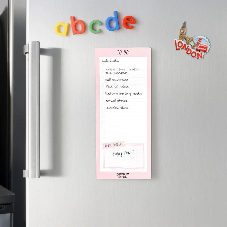 De la colección Carpe Diem, diseñada para inspirar una vida organizada y bonita. Esta lista magnética de tareas es perfecta para tus pendientes diarios o listas de compras, con un diseño práctico y sencillo que te ayuda a mantener todo bajo control.