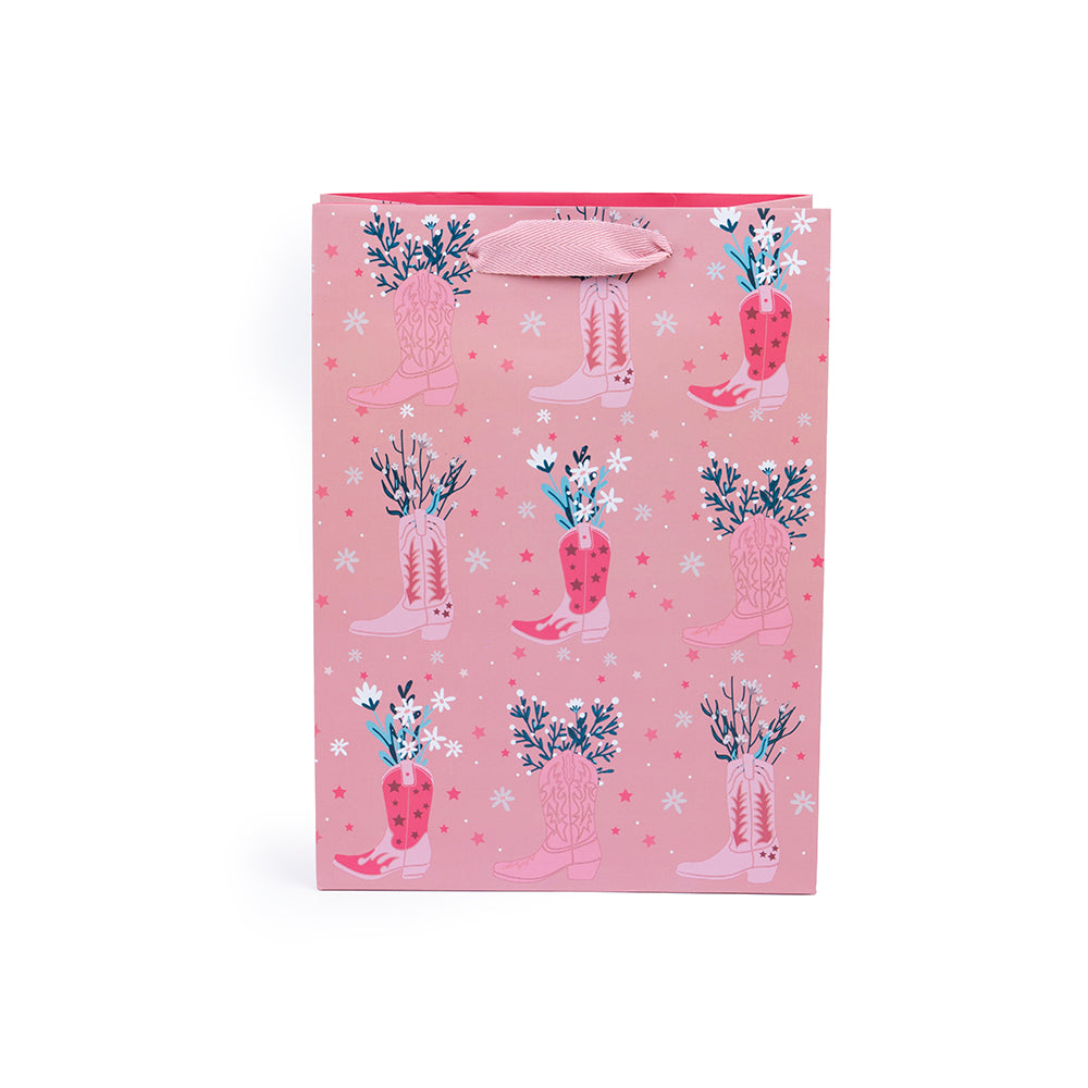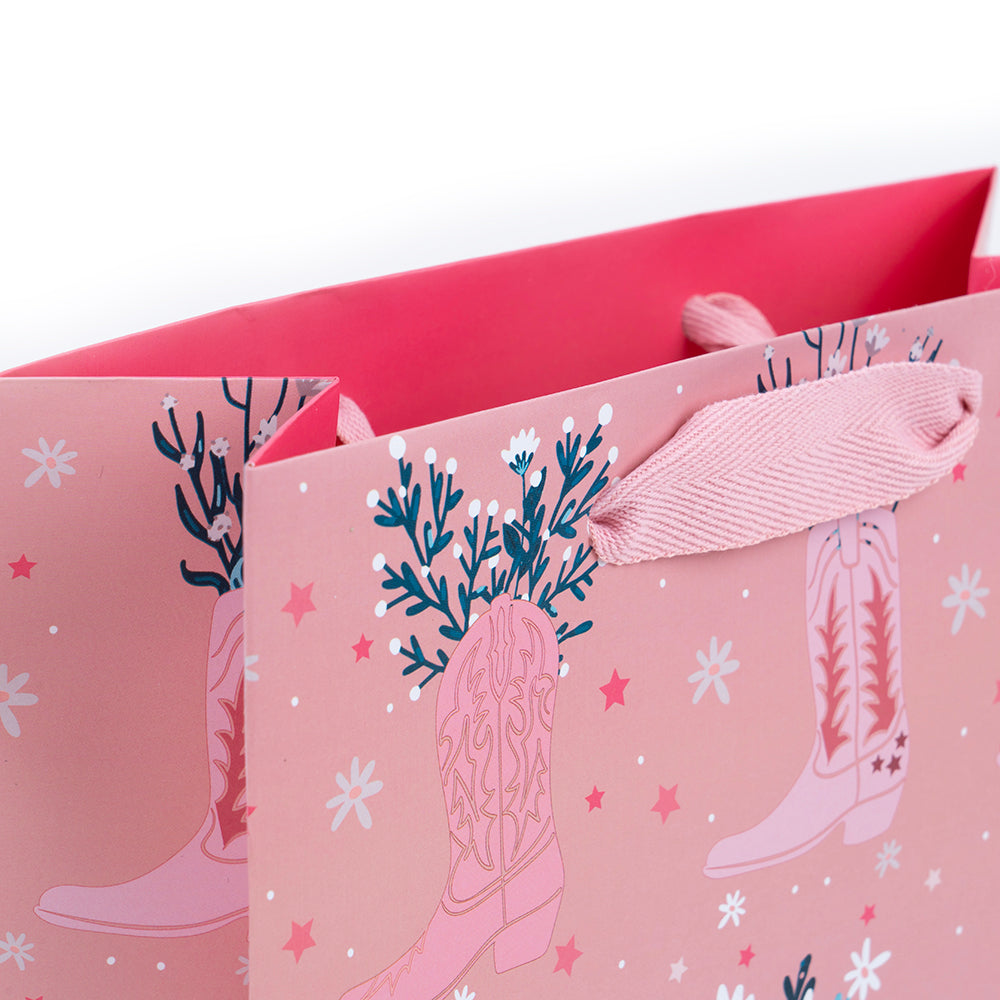 Papel blanco de 200gr, con el fondo reforzado con papel de 280gr. Asas: Cinta de espiga de 2,5 cm de ancho x 25 cm de largo. Tamaño: 22 cms x 30 cms x 10 cms