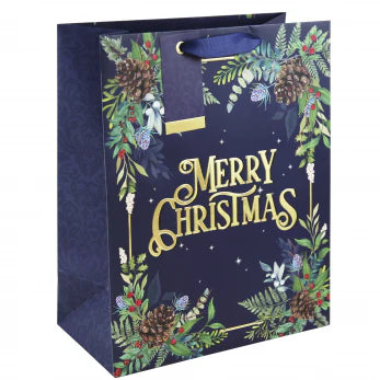 Celebra la Navidad con elegancia con esta sofisticada bolsa de regalo en tono azul marino. Su diseño con ramas, piñas y detalles dorados resalta el mensaje “Merry Christmas”, creando una presentación festiva y refinada. Perfecta para obsequios pequeños, combina resistencia, estilo y el toque justo de brillo navideño.