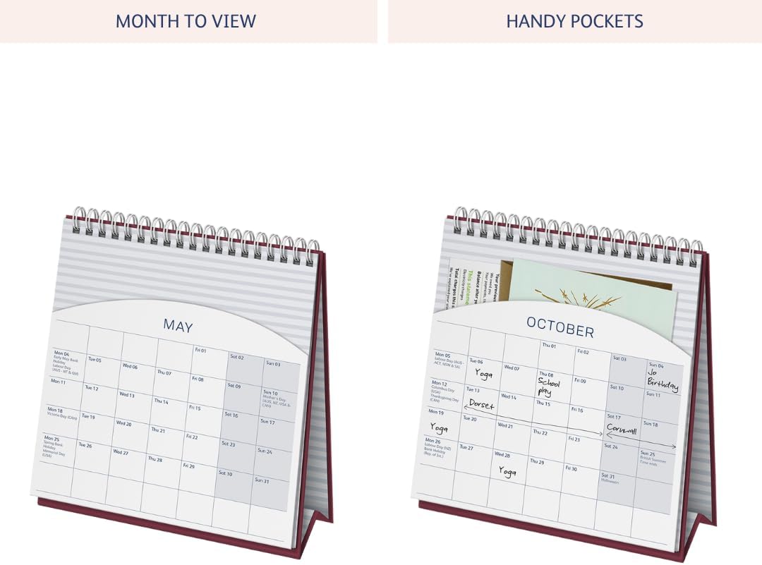 Cada mes cuenta con bolsillos interiores para guardar notas, papeles sueltos o pequeños recordatorios, ayudándote a mantener tu espacio libre de desorden. Los fines de semana resaltados y el flip-top binding facilitan el cambio de mes y la consulta de fechas próximas.