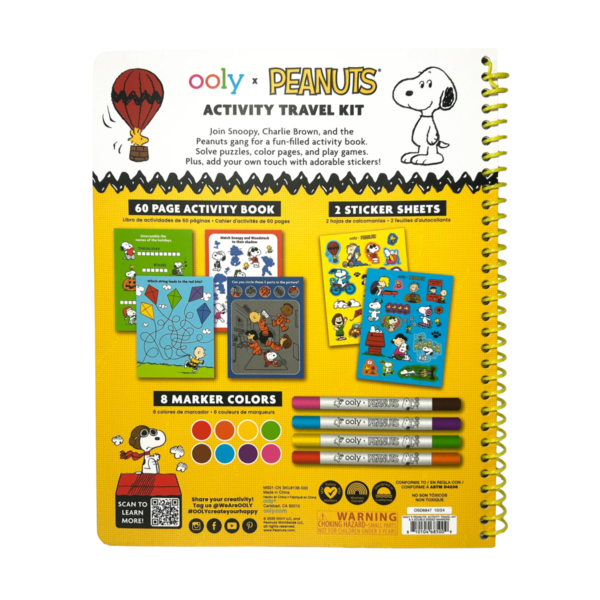 ¡Horas de diversión con el Kit de Viaje de Actividades OOLY x Peanuts, con Snoopy, Charlie Brown y la pandilla de Peanuts! Con un libro de actividades de 60 páginas repleto de rompecabezas, juegos y hojas para colorear, este kit de viaje es perfecto para los niños que adoran las aventuras de la pandilla de Peanuts. El set incluye 4 rotuladores de doble punta de 8 colores y 2 hojas de pegatinas de Peanuts. Con estos juegos de viaje para niños, puedes ayudar a Linus a encontrar su manta o colorear la próxima gran aventura de Snoopy. Este kit de actividades está lleno de diversión para niños y fans de Peanuts de todas las edades.