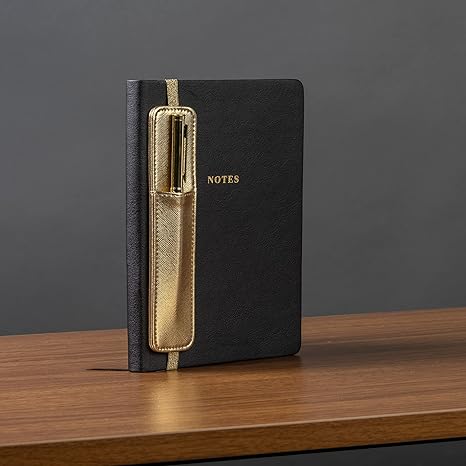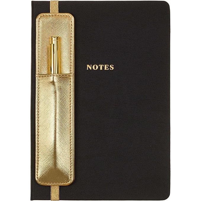 Esta libreta cuenta con una cubierta negra con relieve dorado, un cierre de banda elástica con un soporte de bolsillo para bolígrafo y bolígrafo incluido