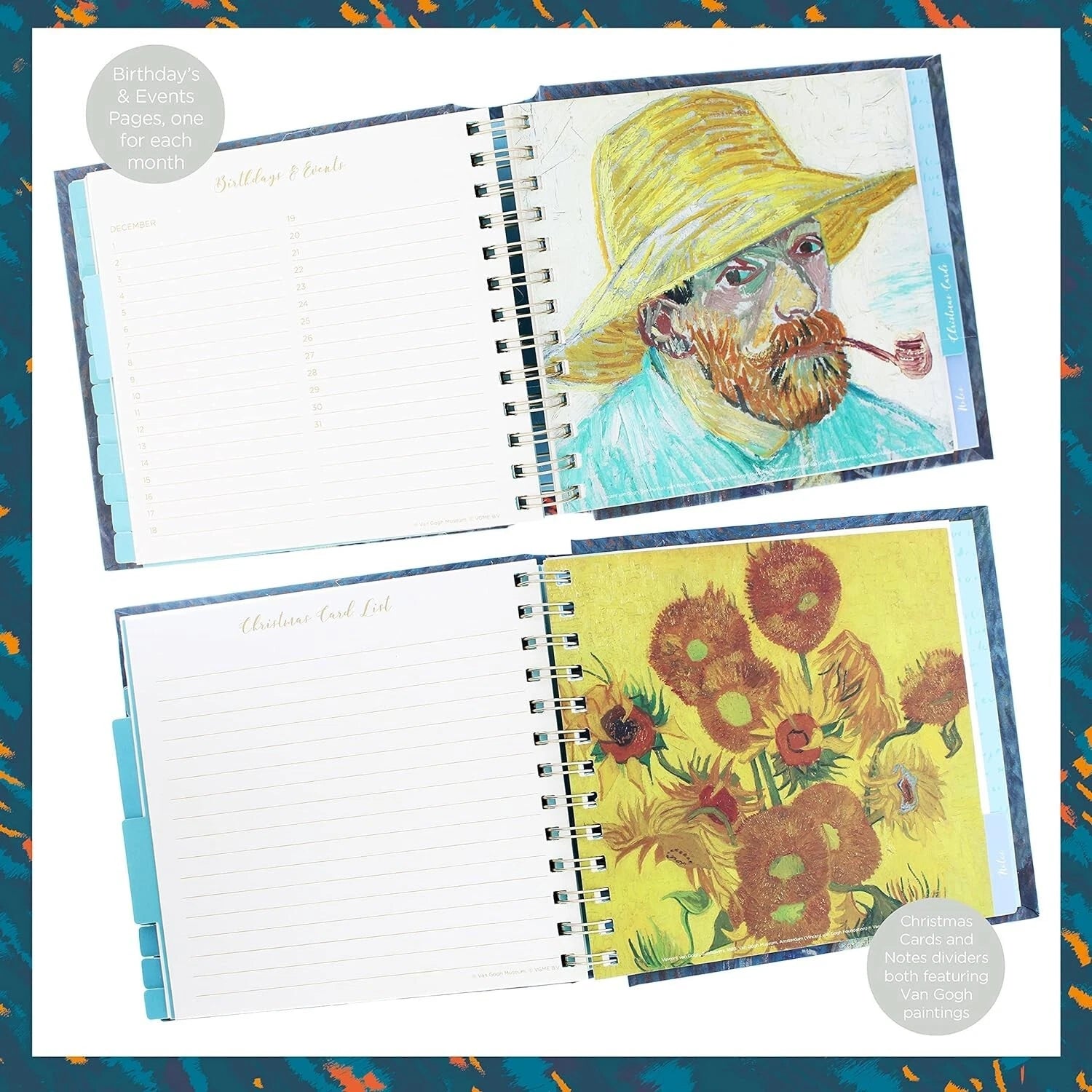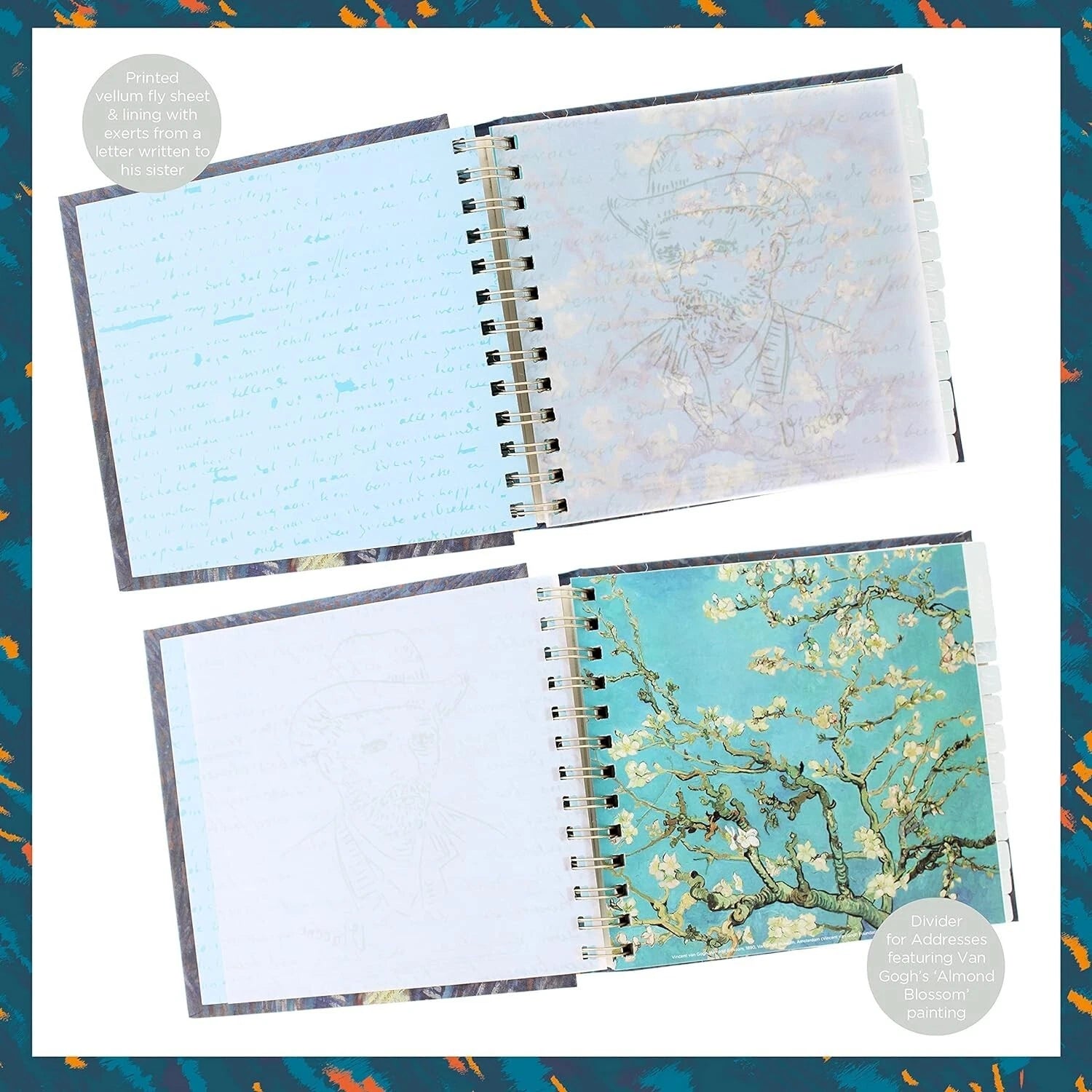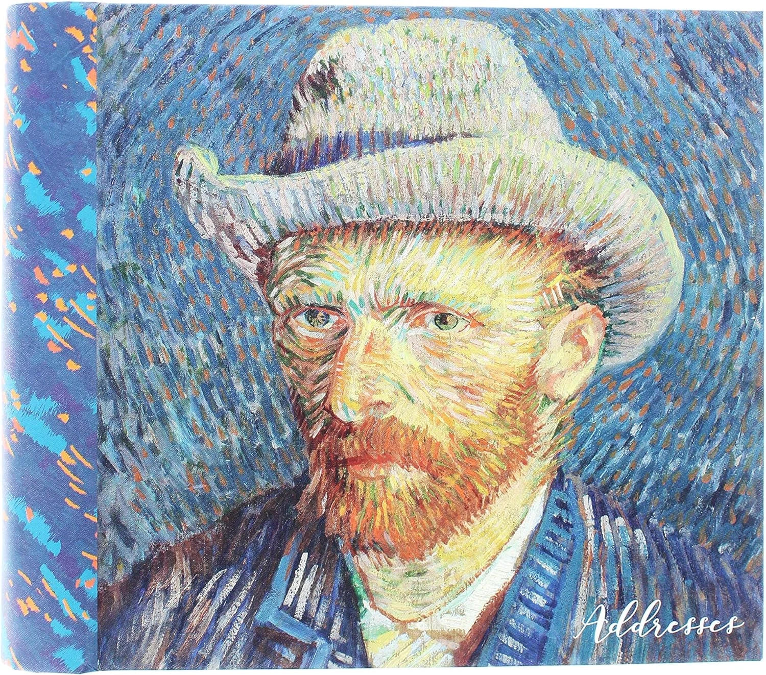 Elegante libreta de direcciones inspirada en el famoso autorretrato que Van Gogh pintó en 1887. Cuenta con índice alfabético para organizar contactos y apartados específicos para registrar direcciones, cumpleaños y eventos importantes. Incluye listas para tarjetas de Navidad y espacio para notas. Ideal para mantener todo en orden con estilo artístico y atemporal.
