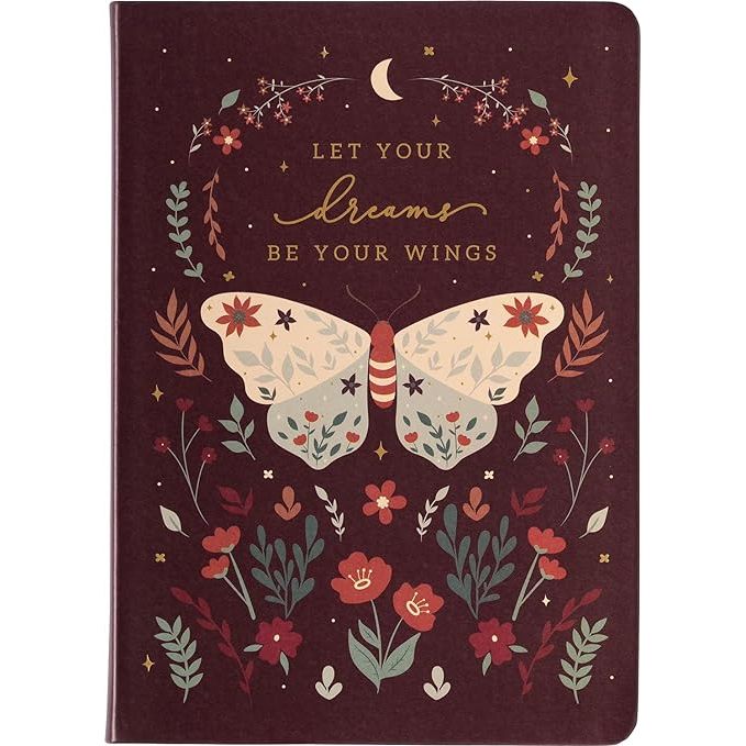 Esta libreta cuenta con una cubierta de color ciruela adornada con mariposas y estampados florales. Tamaño personal, cubierta flexible, estilo y práctico